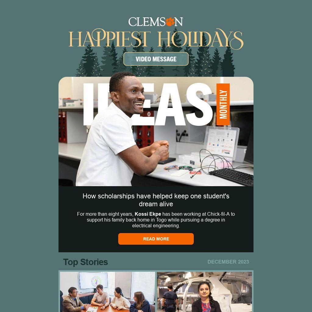 IDEAS Monthly is published by the PROMO Office in Clemson University’s College of Engineering, Computing and Applied Sciences. Contact the team with feedback or story suggestions.