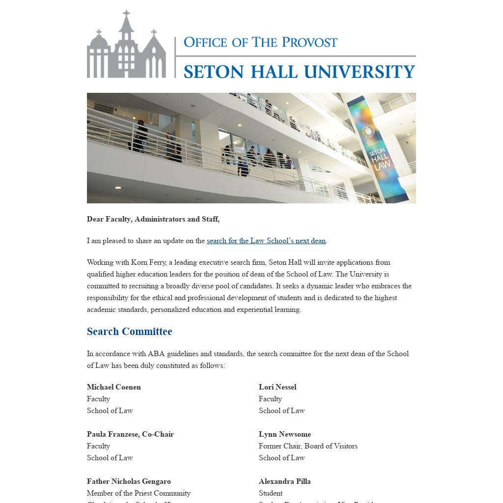 Working with Korn Ferry, a leading executive search firm, Seton Hall will invite applications from qualified higher education leaders for the position of dean of the School of Law. The University is committed to recruiting a broadly diverse pool of candidates. It seeks a dynamic leader who embraces the responsibility for the ethical and professional development of students and is dedicated to the highest academic standards, personalized education and experiential learning.