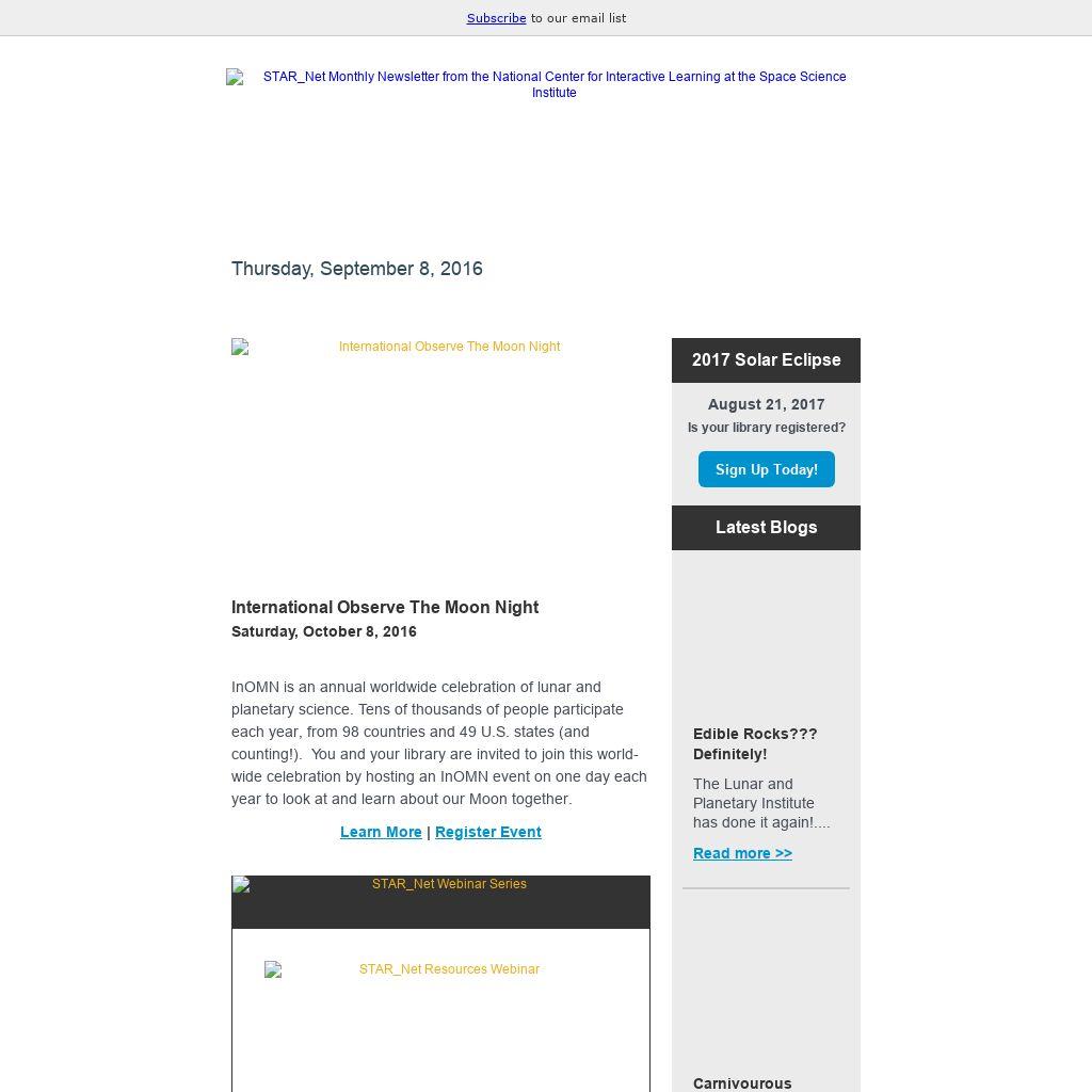 In just over a year from now, on August 21, 2017, the shadow of the moon will sweep across the United States from the Pacific Ocean to the Atlantic Ocean in a spectacle that hasn't occurred in decades. In fact, the last total solar eclipse for the United States was nearly 40 years ago, and the next total eclipse that will be visible in the continental United States will be in 2024. The STAR_Net team wants to work with your library and thousands of others to participate in this national event. So jump on the eclipse train!