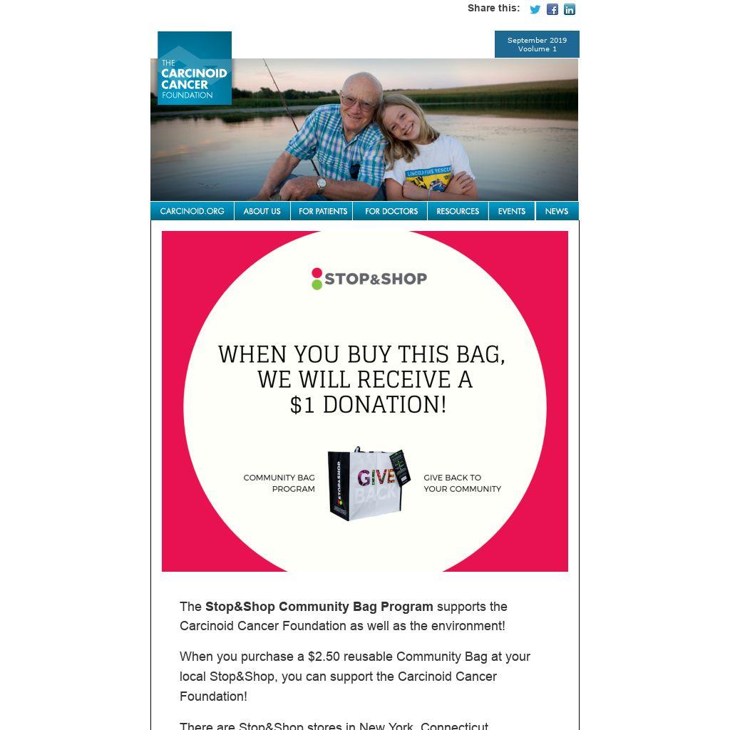 When you purchase a $2.50 reusable Community Bag at your local Stop&Shop, you can support the Carcinoid Cancer Foundation!
