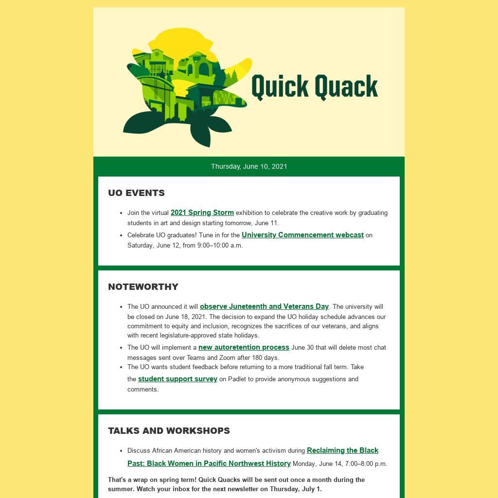 That's a wrap on spring term! Quick Quacks will be sent out once a month during the summer. Watch your inbox for the next newsletter on Thursday, July 1.