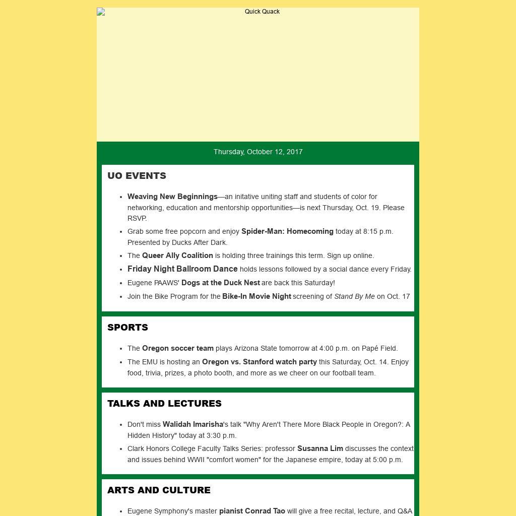 The EMU is hosting anOregon vs. Stanford watch partythis Saturday, Oct. 14. Enjoy food, trivia, prizes, a photo booth, and more as we cheer on our football team.