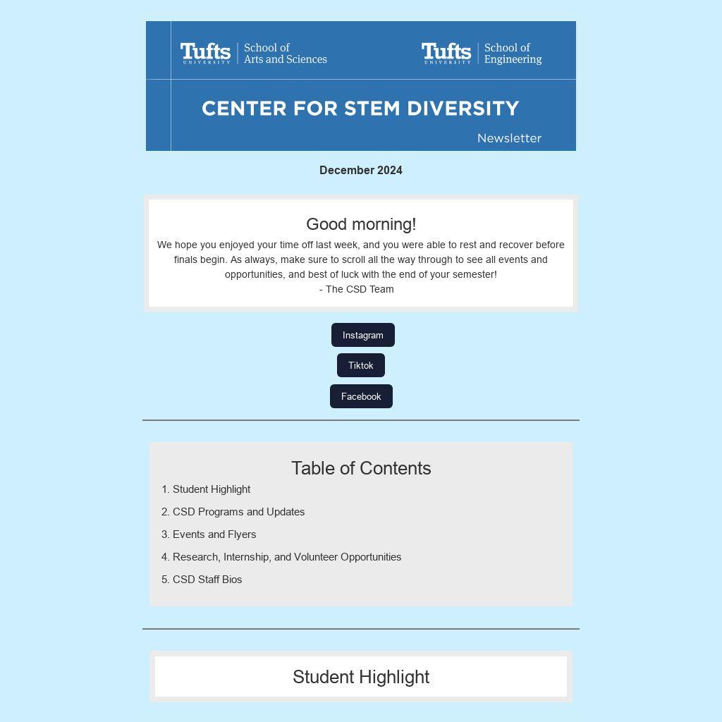 Want to be our Student Highlight?Nominate yourself or a fellow peer to be our Student Highlight! Write two paragraphs about the student’s accomplishment(s) and why you think this person should be student of the month. Email your nominations to stemdiversity@tufts.edu with the subject line: Student Highlight.