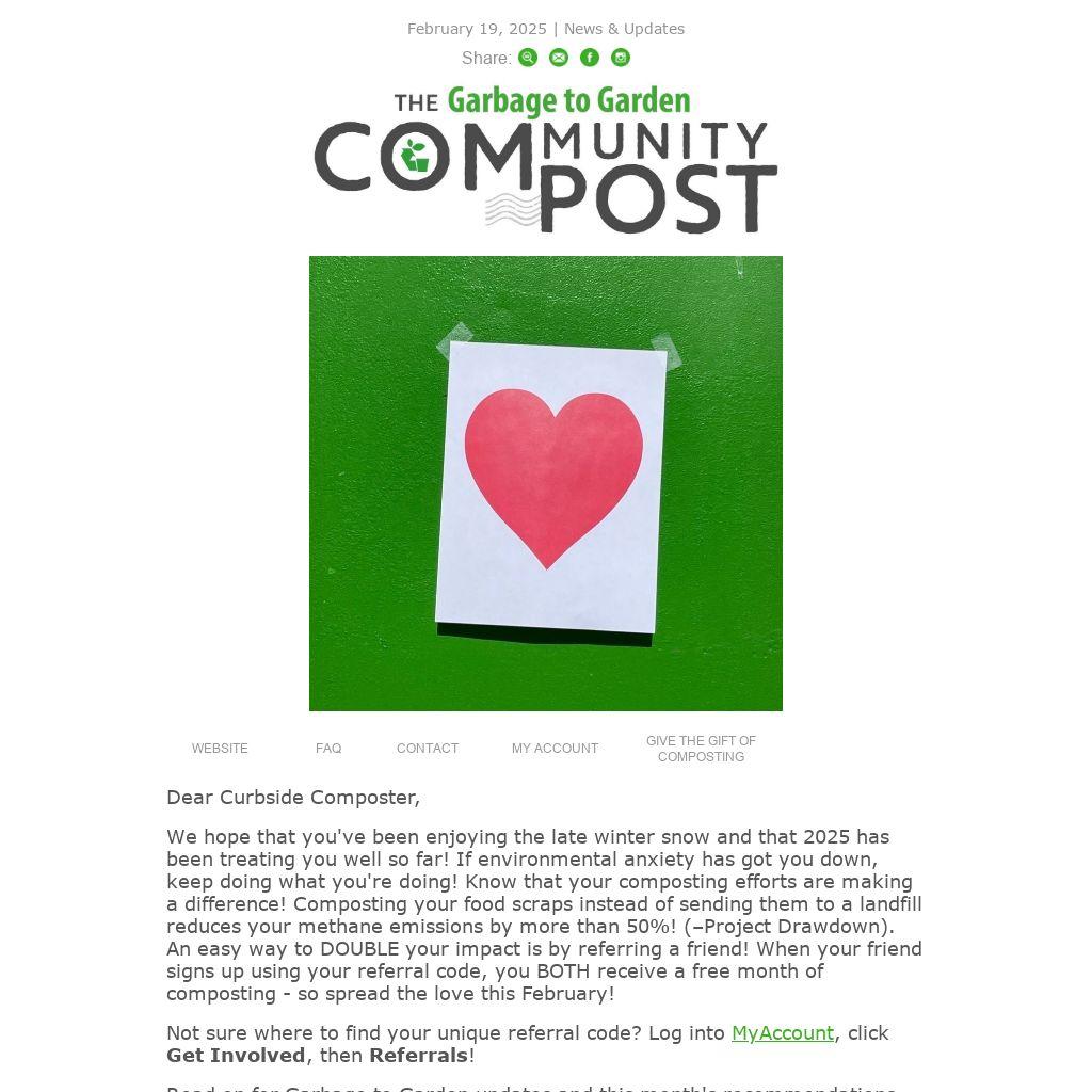 We hope that you've been enjoying the late winter snow and that 2025 has been treating you well so far! If environmental anxiety has got you down, keep doing what you're doing! Know that your composting efforts are making a difference! Composting your food scraps instead of sending them to a landfill reduces your methane emissions by more than 50%! (–Project Drawdown). An easy way to DOUBLE your impact is by referring a friend! When your friend signs up using your referral code, you BOTH receive a free month of composting - so spread the love this February!