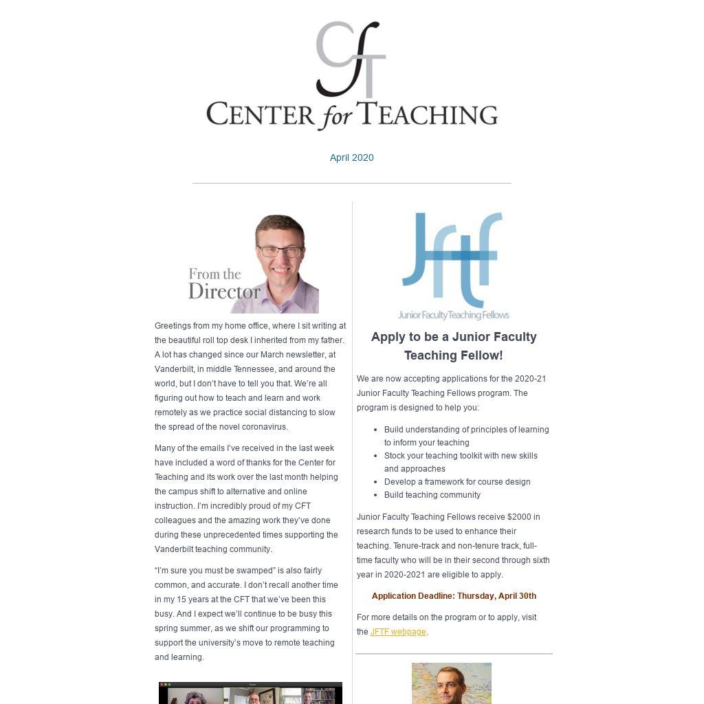 Many of the emails I’ve received in the last week have included a word of thanks for the Center for Teaching and its work over the last month helping the campus shift to alternative and online instruction. I’m incredibly proud of my CFT colleagues and the amazing work they’ve done during these unprecedented times supporting the Vanderbilt teaching community.