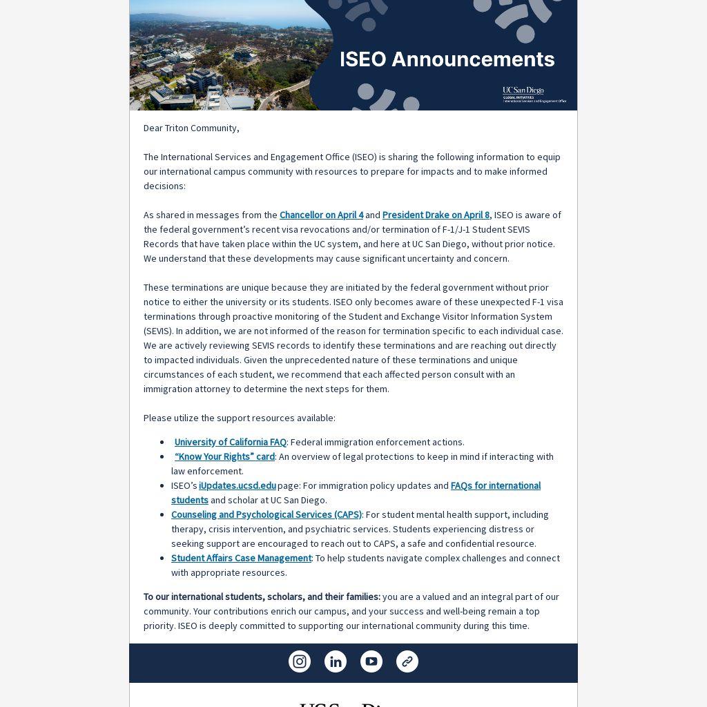 As shared in messages from the Chancellor on April 4 and President Drake on April 8, ISEO is aware of the federal government’s recent visa revocations and/or termination of F-1/J-1 Student SEVIS Records that have taken place within the UC system, and here at UC San Diego, without prior notice. We understand that these developments may cause significant uncertainty and concern.