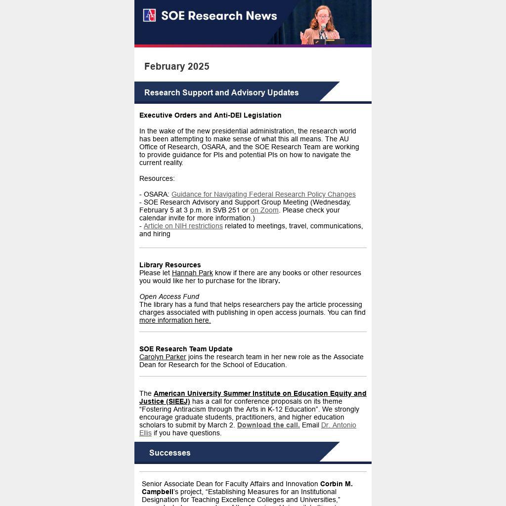 The first few days of the new presidential administration have been filled with chaos and uncertainty, causing questions and concerns about research funding, both current and potential. American University's School of Education remains dedicated to the values of excellence, equity, antiracism and social justice, diversity and inclusion, collaboration, and innovation no matter what is happening on the political landscape. This SOE Research Advisory and Support Group Meeting on will be an opportunity for faculty and staff to gather to hear the latest updates, share concerns, and brainstorm possibilities. This will be a hybrid meeting, in-person in SVB 251 and on Zoom.