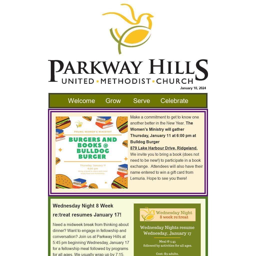 January 24: Bridge,Youth, and Adults: Ministry Fair highlighting all the ways to connect at Parkway Hills. Kids 4th and under Science Night. January 31: Youth and Adults: Share about our Mission and Ministry Day Apart. Kids:4th and under:Spirtual Practices. Bridge:Game night. February 7: First meeting of our 2024 Leadership Board. Adults: Conversation in Worship Center. Youth:Homework Night. Bridge:Menchies Night Out. Kids: Art Night. February 21: Bridge, Youth, and Adults: Conversations around our questions coming from Scripture; Part 1 (more info to come).