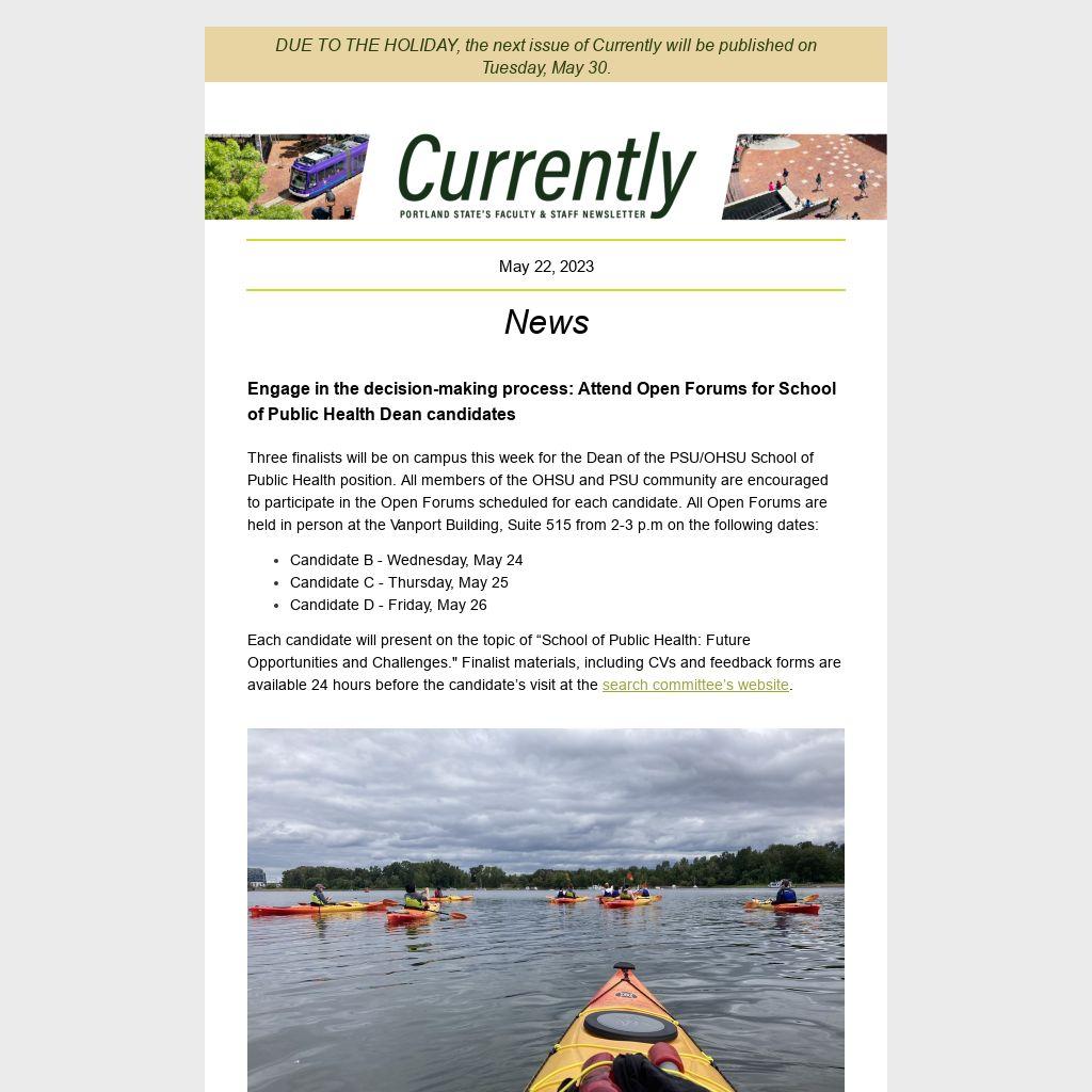 Currently is Portland State University’s weekly faculty and staff newsletter. It is published online every Monday during the academic year by University Communications. News items should be emailed by noon the Tuesday before publication. See theCurrently websitefor submission guidelines and schedule.