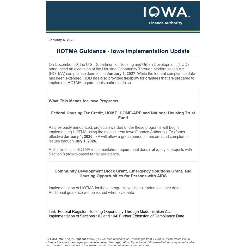As previously announced, projects awarded under these programs will begin implementing HOTMA using the most current Iowa Finance Authority (IFA) forms effective January 1, 2026. IFA will allow a grace period for uncorrected compliance issues through July 1, 2026.