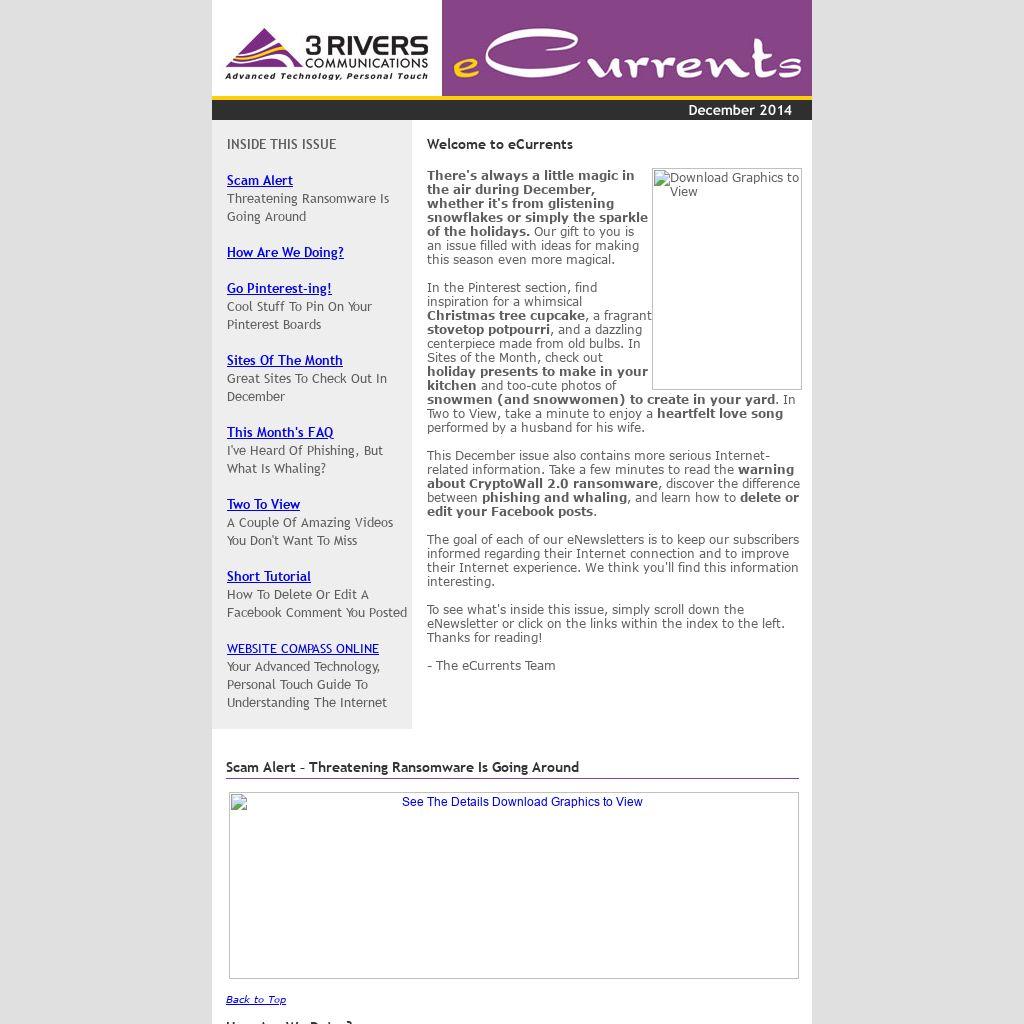 This December issue also contains more serious Internet-related information. Take a few minutes to read the warning about CryptoWall 2.0 ransomware, discover the difference between phishing and whaling, and learn how to delete or edit your Facebook posts.