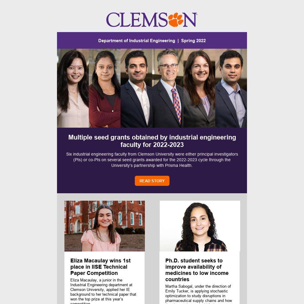 The Industrial Engineering Newsletter is published by the Department and the PROMO Office in Clemson University’s College of Engineering, Computing and Applied Sciences.