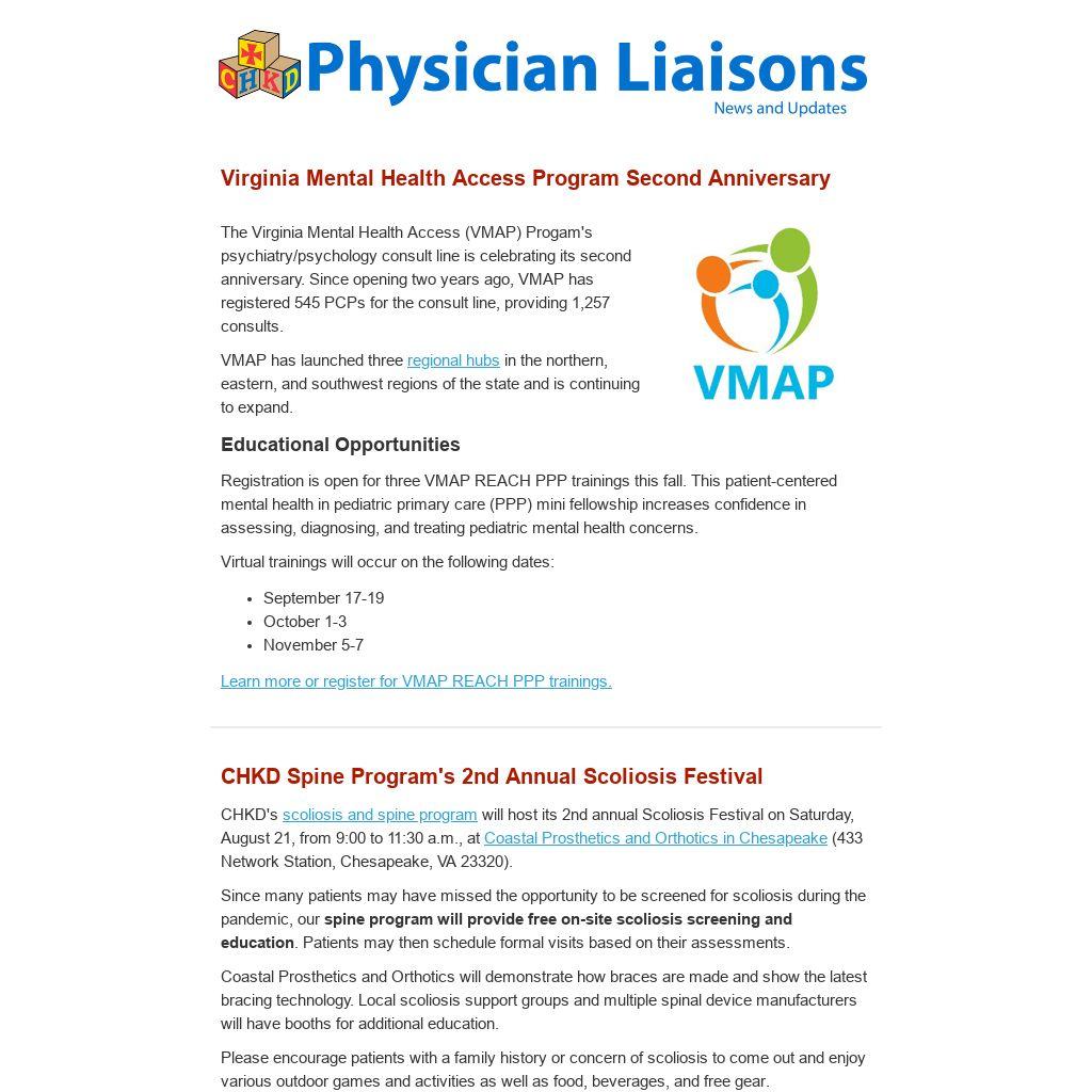 The Virginia Mental Health Access (VMAP) Progam's psychiatry/psychology consult line is celebrating its second anniversary. Since opening two years ago, VMAP has registered 545 PCPs for the consult line, providing 1,257 consults.