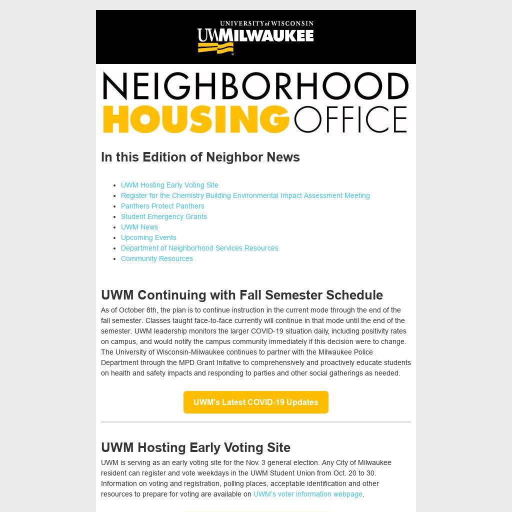 UWM will be hosting a virtual Draft Environmental Meeting for the UW-Milwaukee Chemistry Building - (DFDM Project #18H3D) on Oct. 12 at 5 p.m. Please register for the meeting here. After registering for the meeting, you will receive a confirmation email containing information to join the webinar on October 12th. Email Alison.kuhne@graef-usa.com with any questions about joining the meeting prior to October 12th.
