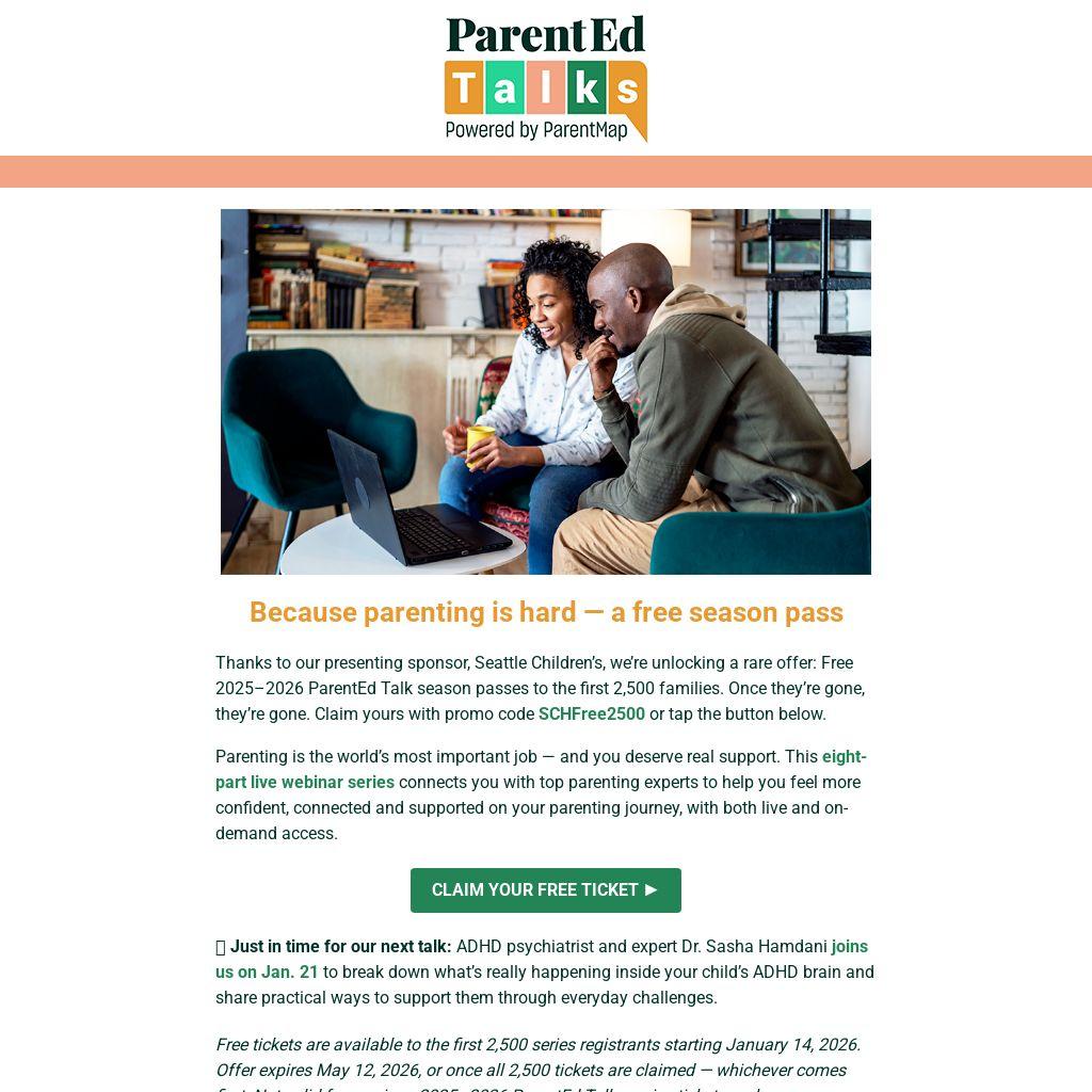 Thanks to our presenting sponsor, Seattle Children’s, we’re unlocking a rare offer: Free 2025–2026 ParentEd Talk season passes to the first 2,500 families. Once they’re gone, they’re gone. Claim yours with promo code SCHFree2500 or tap the button below.