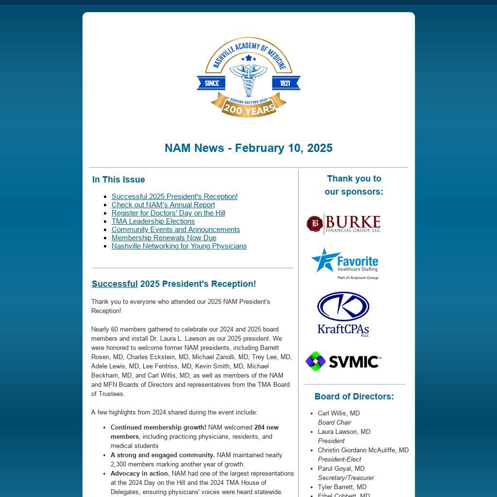 Explore the latest Nashville Academy of Medicine Annual Report, highlighting our dedicated Board of Directors and our mission to support physicians, practices, and community health. With 18 practices, 92 specialties and subspecialties, and a growing membership of more than 2,300 physicians, NAM continues to make a lasting impact.