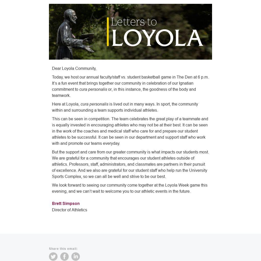 We look forward to seeing our community come together at the Loyola Week game this evening, and we can’t wait to welcome you to our athletic events in the future.