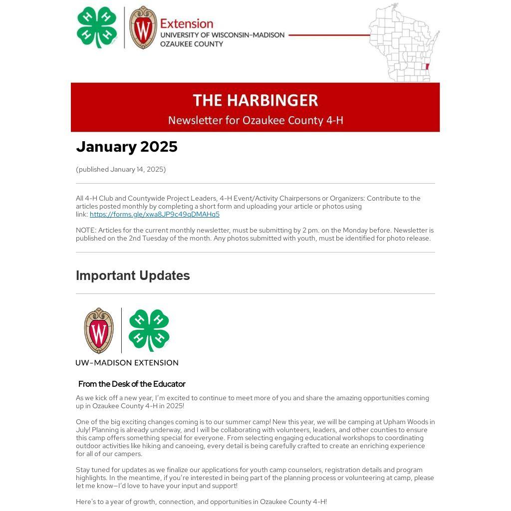 Harbinger Newsletter Published Monthly. The 4-H Harbinger newsletter will be published monthly on the second Tuesday of each month. Please adjust your 4-H club, group, and project announcement schedules as needed.