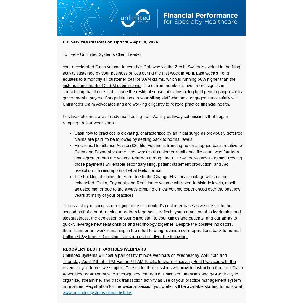 In addition to active delivery of the resources described in this week’s restoration update, Unlimited Systems is designing and validating new customer-facing assets to bring forward to you as we complete EDI Services Restoration and enter the final stages of recovery from the Change Healthcare cyberattack. We remain fully committed to organizing collectively and interacting individually with every one of our valued customers through and past this industry event.