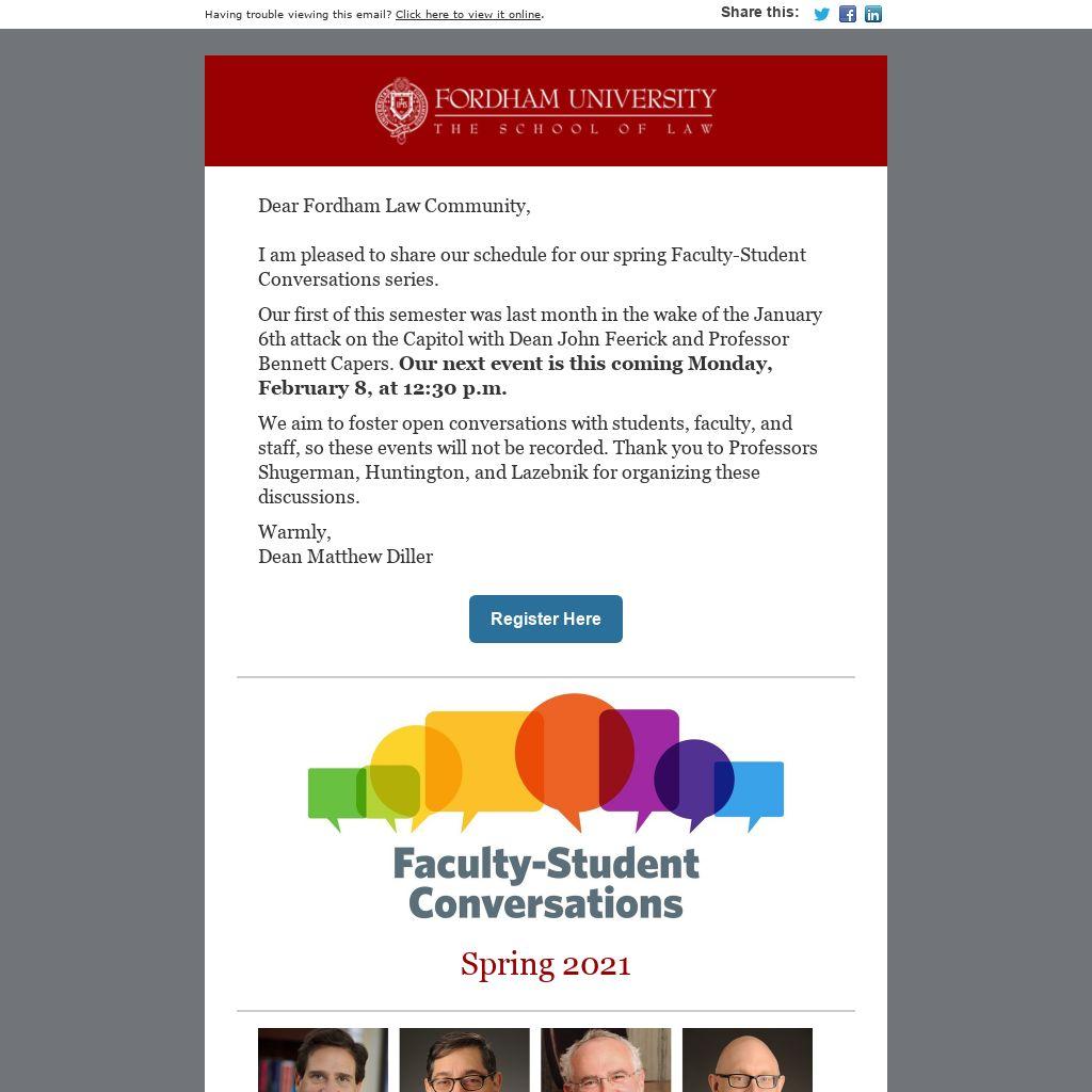 I am pleased to share our schedule for our spring Faculty-Student Conversations series.