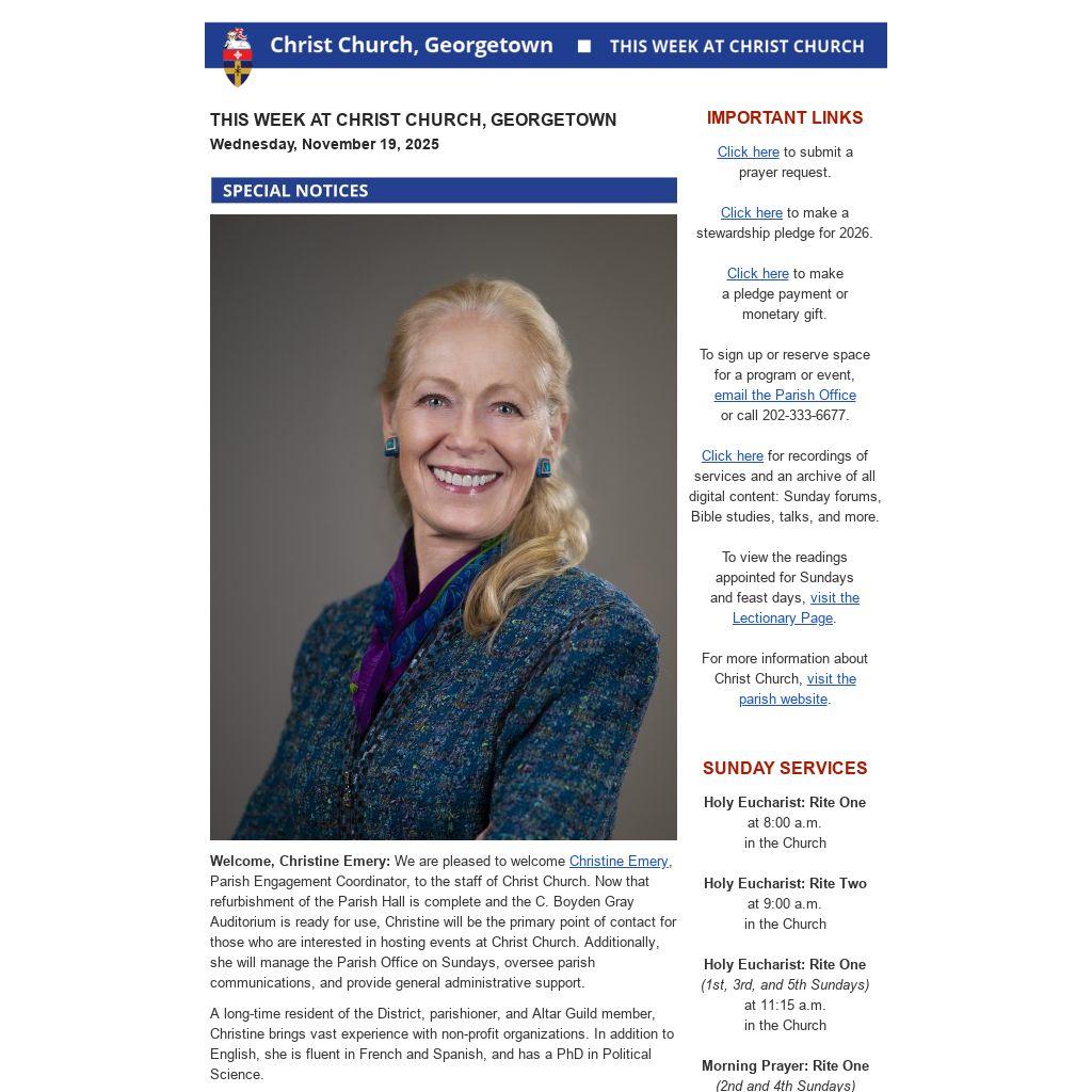 Welcome, Christine Emery: We are pleased to welcome Christine Emery, Parish Engagement Coordinator, to the staff of Christ Church. Now that refurbishment of the Parish Hall is complete and the C. Boyden Gray Auditorium is ready for use, Christine will be the primary point of contact for those who are interested in hosting events at Christ Church. Additionally, she will manage the Parish Office on Sundays, oversee parish communications, and provide general administrative support.