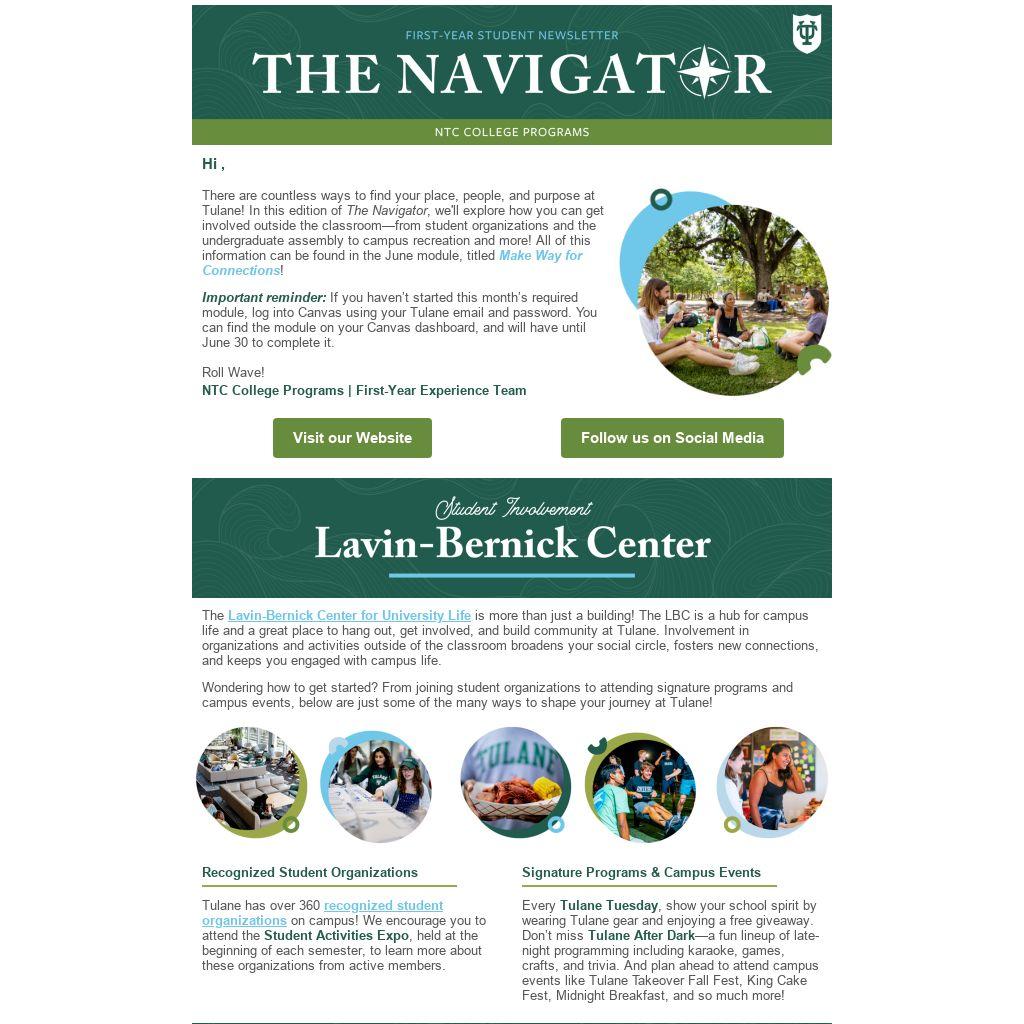 Up Next in The Navigator: You'll be introduced to Housing & Residence Life and explore how living and learning blend seamlessly to enrich your undergraduate experience. Plus, you'll discover how you can prepare for your Move-In day! Stay tuned and check your Tulane inbox on July 1 for the next edition!