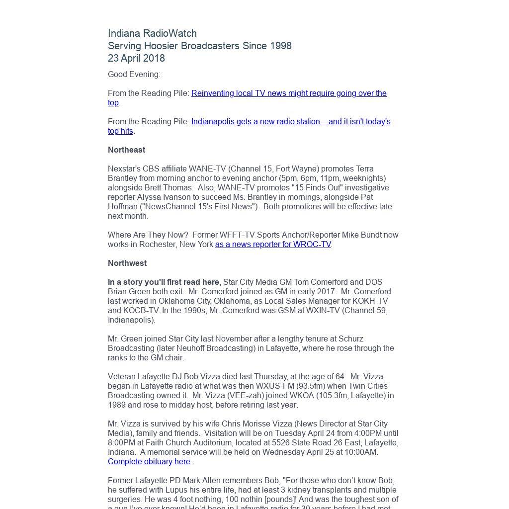 Indiana RadioWatch subscriptions are free. To subscribe, send an e-mail to irw@well.com and we'll add you. After publication, we archive Indiana RadioWatch on the Indiana Radio Archive at http://www.indianaradio.net. Please e-mail us your news stories and employment opportunities.