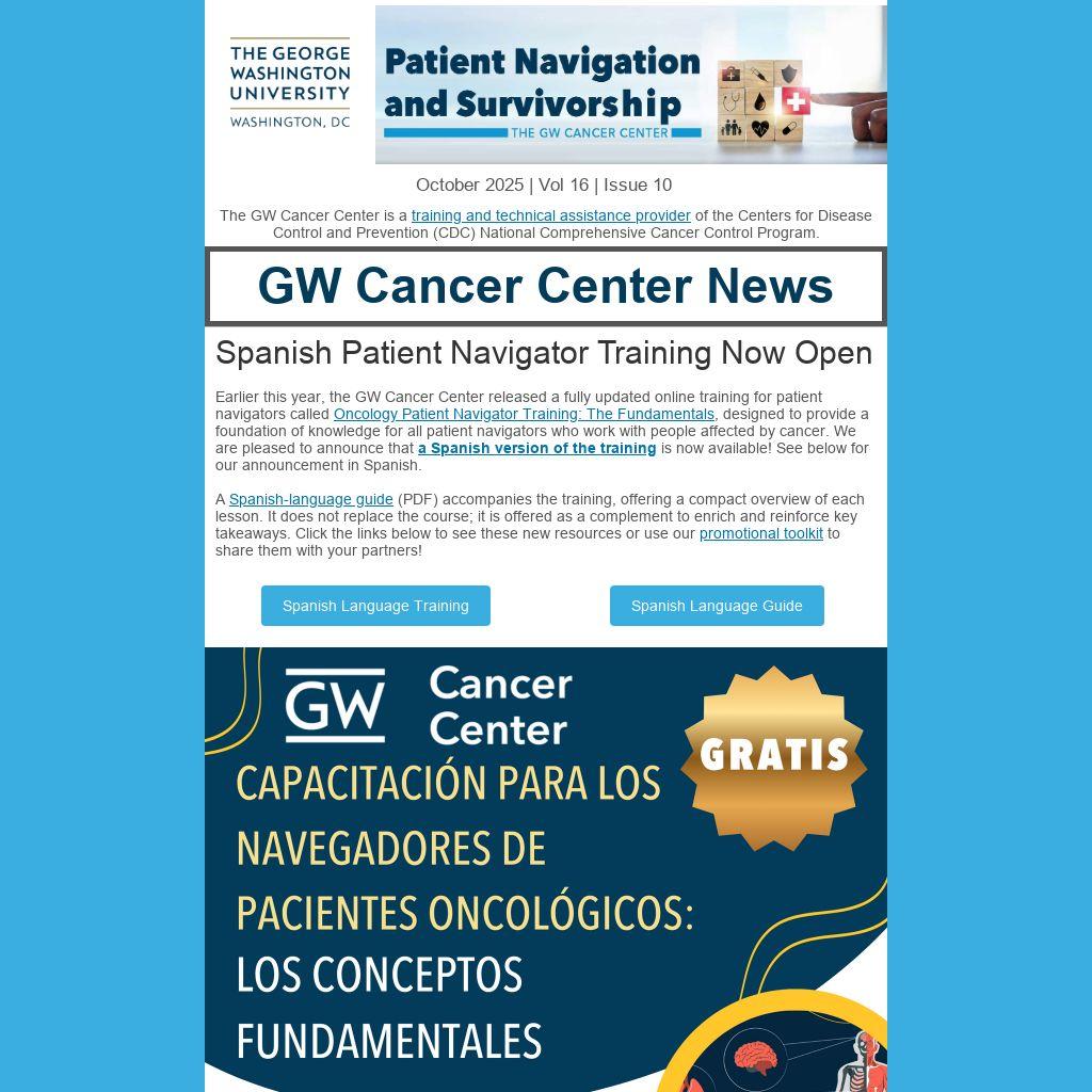 Earlier this year, the GW Cancer Center released a fully updated online training for patient navigators called Oncology Patient Navigator Training: The Fundamentals, designed to provide a foundation of knowledge for all patient navigators who work with people affected by cancer. We are pleased to announce that a Spanish version of the training is now available! See below for our announcement in Spanish.