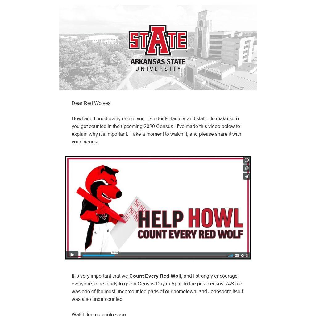 Howl and I need every one of you – students, faculty, and staff – to make sure you get counted in the upcoming 2020 Census. I’ve made this video below to explain why it’s important. Take a moment to watch it, and please share it with your friends.