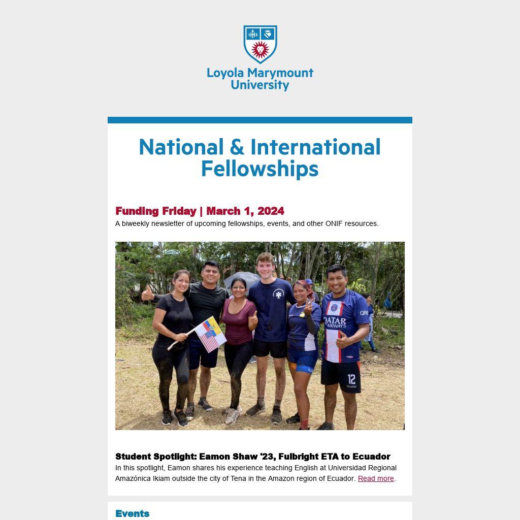 Learn more about the Fulbright U.S. Student Program by attending LMU's inaugural Fulbright Day! Fulbright offers fully funded grants to teach English, pursue graduate study, or conduct independent research/creative arts projects in over 140 countries.