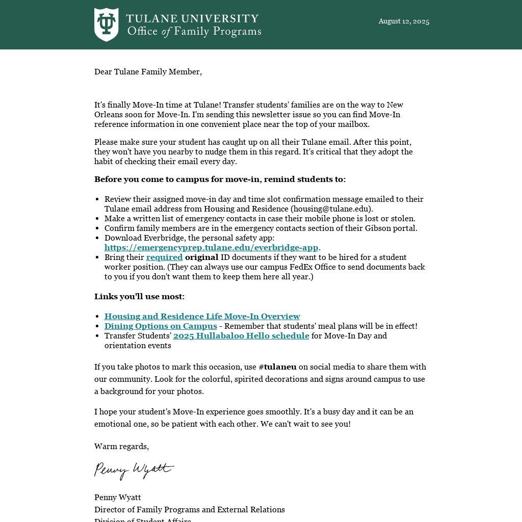 It's finally Move-In time at Tulane! Transfer students' families are on the way to New Orleans soon for Move-In. I'm sending this newsletter issue so you can find Move-In reference information in one convenient place near the top of your mailbox.