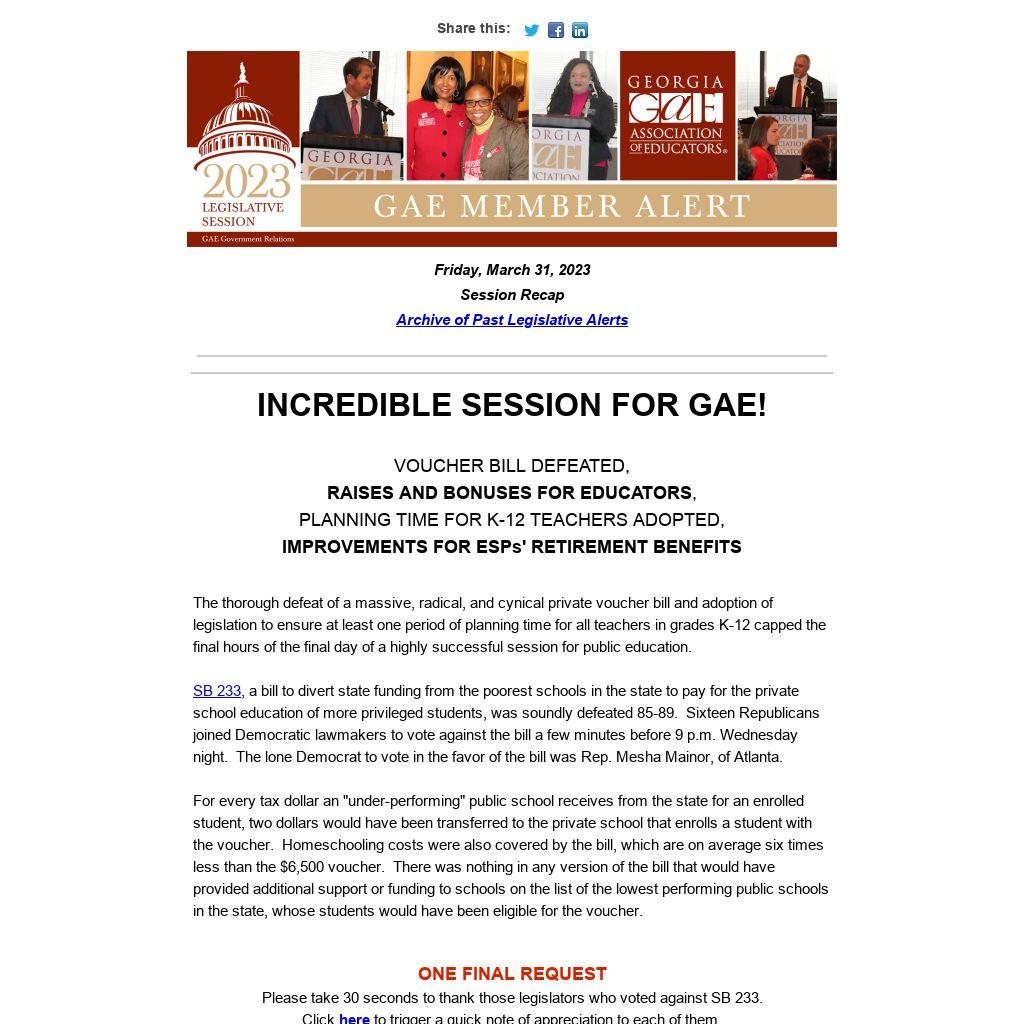 GAE appreciates the hard work of Rep. John Corbett, R-Lake City - the sponsor of the bill - in getting this bill across the line. Please take a moment to send Rep. Corbett a message of appreciation at: john.corbett@house.ga.gov.