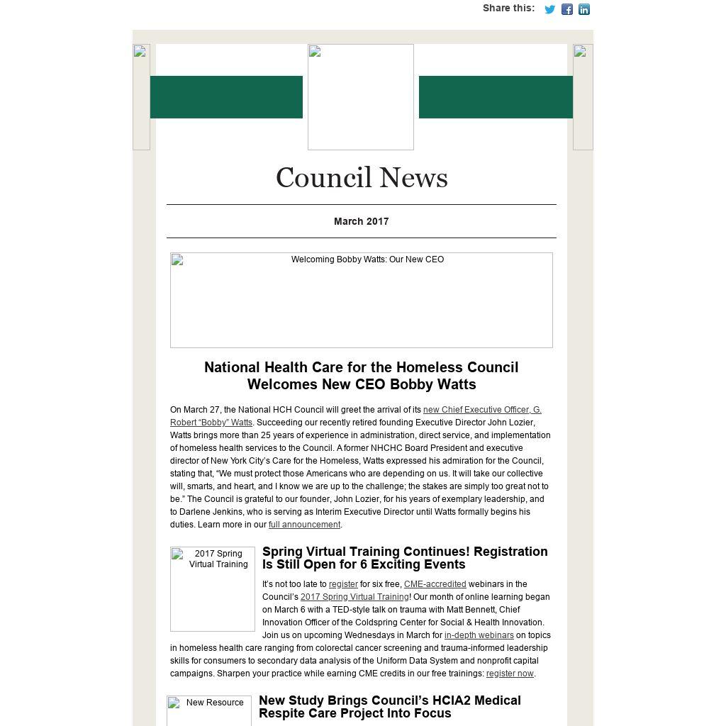 | Spring Virtual Training Continues! Registration Is Still Open for 6 Exciting Events It’s not too late to register for six free, CME-accredited webinars in the Council’s 2017 Spring Virtual Training! Our month of online learning began on March 6 with a TED-style talk on trauma with Matt Bennett, Chief Innovation Officer of the Coldspring Center for Social & Health Innovation. Join us on upcoming Wednesdays in March for in-depth webinars on topics in homeless health care ranging from colorectal cancer screening and trauma-informed leadership skills for consumers to secondary data analysis of the Uniform Data System and nonprofit capital campaigns. Sharpen your practice while earning CME credits in our free trainings: register now.