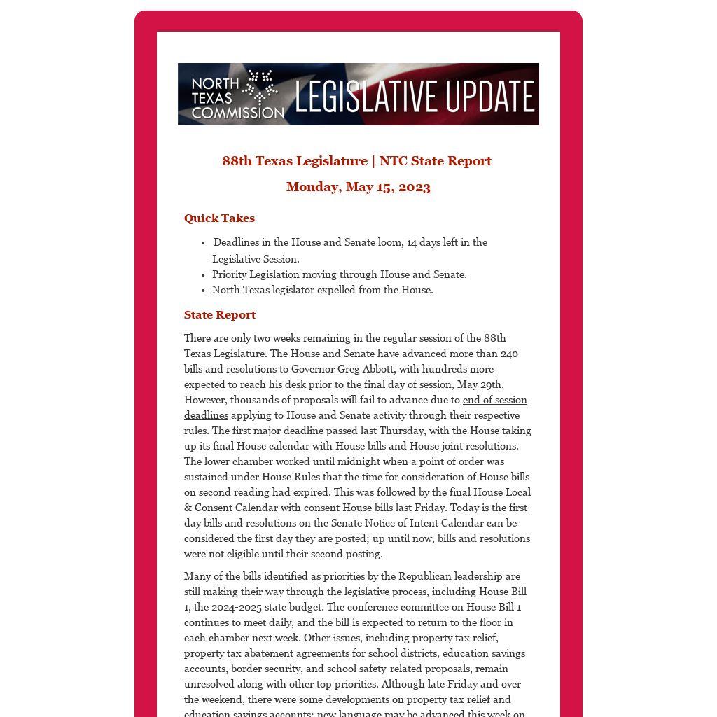 There are only two weeks remaining in the regular session of the 88th Texas Legislature. The House and Senate have advanced more than 240 bills and resolutions to Governor Greg Abbott, with hundreds more expected to reach his desk prior to the final day of session, May 29th. However, thousands of proposals will fail to advance due to end of session deadlines applying to House and Senate activity through their respective rules. The first major deadline passed last Thursday, with the House taking up its final House calendar with House bills and House joint resolutions. The lower chamber worked until midnight when a point of order was sustained under House Rules that the time for consideration of House bills on second reading had expired. This was followed by the final House Local & Consent Calendar with consent House bills last Friday. Today is the first day bills and resolutions on the Senate Notice of Intent Calendar can be considered the first day they are posted; up until now, bills and resolutions were not eligible until their second posting.