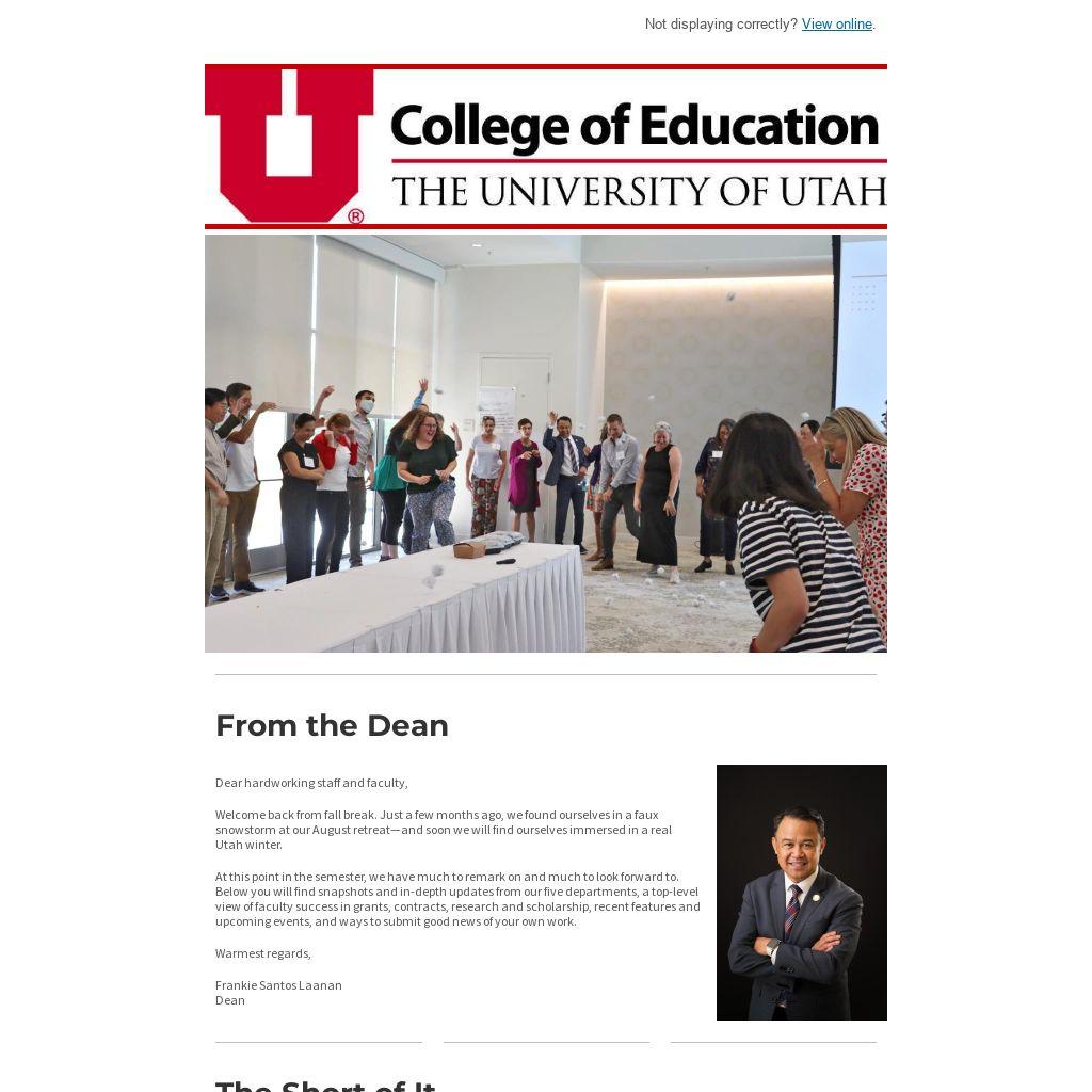 Welcome back from fall break. Just a few months ago, we found ourselves in a faux snowstorm at our August retreat—and soon we will find ourselves immersed in a real Utah winter.