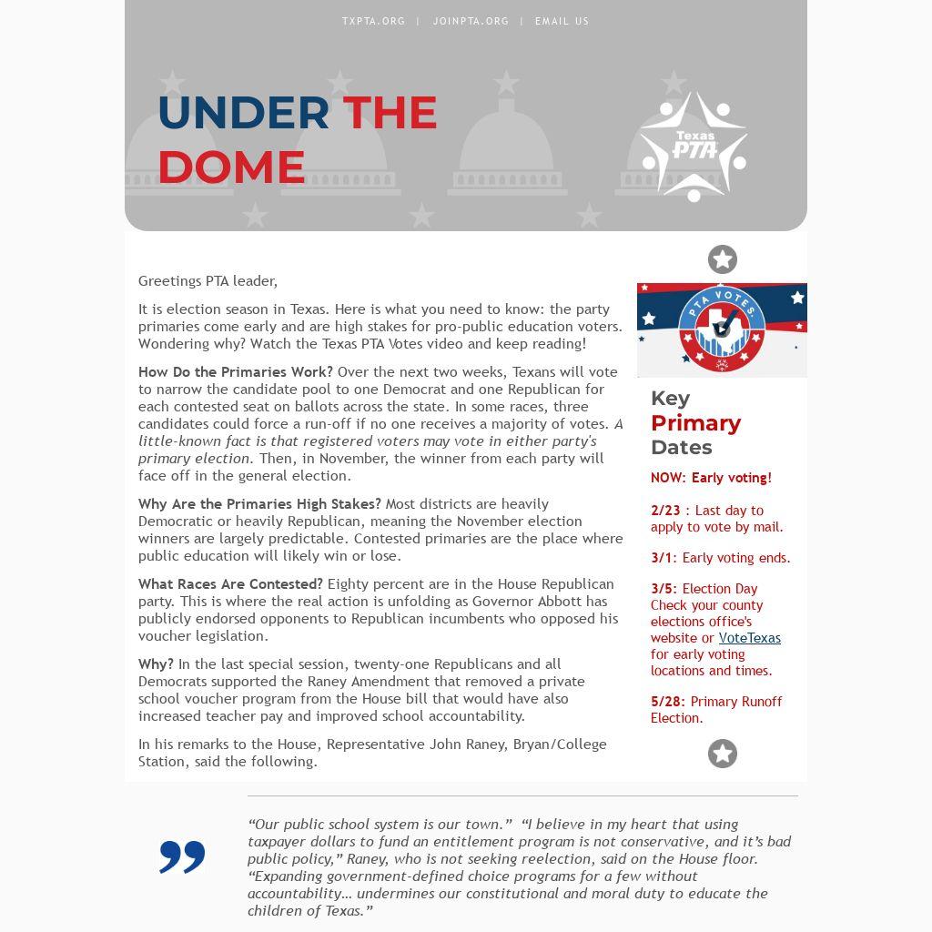 It is election season in Texas. Here is what you need to know: the party primaries come early and are high stakes for pro-public education voters. Wondering why? Watch the Texas PTA Votes video and keep reading!