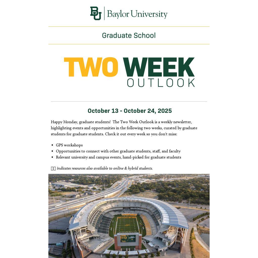 Happy Monday, graduate students! Â The Two Week Outlook is a weekly newsletter, highlighting events and opportunities in the following two weeks, curated by graduate students for graduate students. Check it out every week so you don't miss: