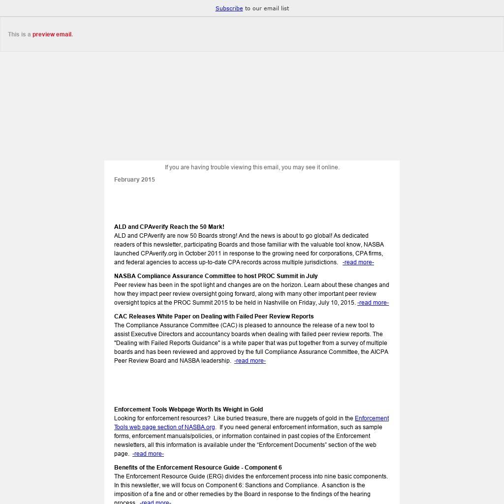 Enforcement Tools Webpage Worth Its Weight in Gold Looking for enforcement resources? Like buried treasure, there are nuggets of gold in the Enforcement Tools web page section of NASBA.org. If you need general enforcement information, such as sample forms, enforcement manuals/policies, or information contained in past copies of the Enforcement newsletters, all this information is available under the “Enforcement Documents” section of the web page.-read more-