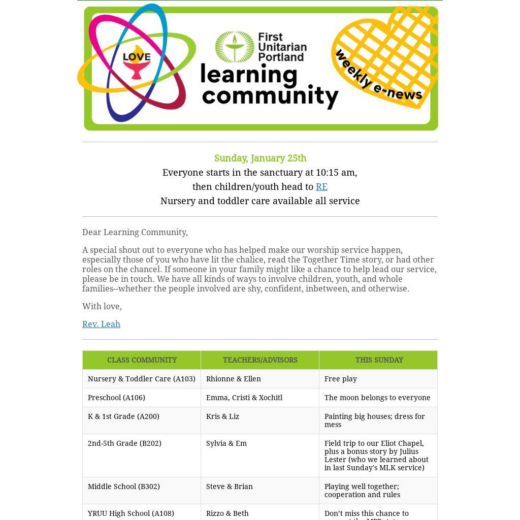 | Field trip to our Eliot Chapel, plus a bonus story by Julius Lester (who we learned about in last Sunday's MLK service) | | Middle School (B302) |