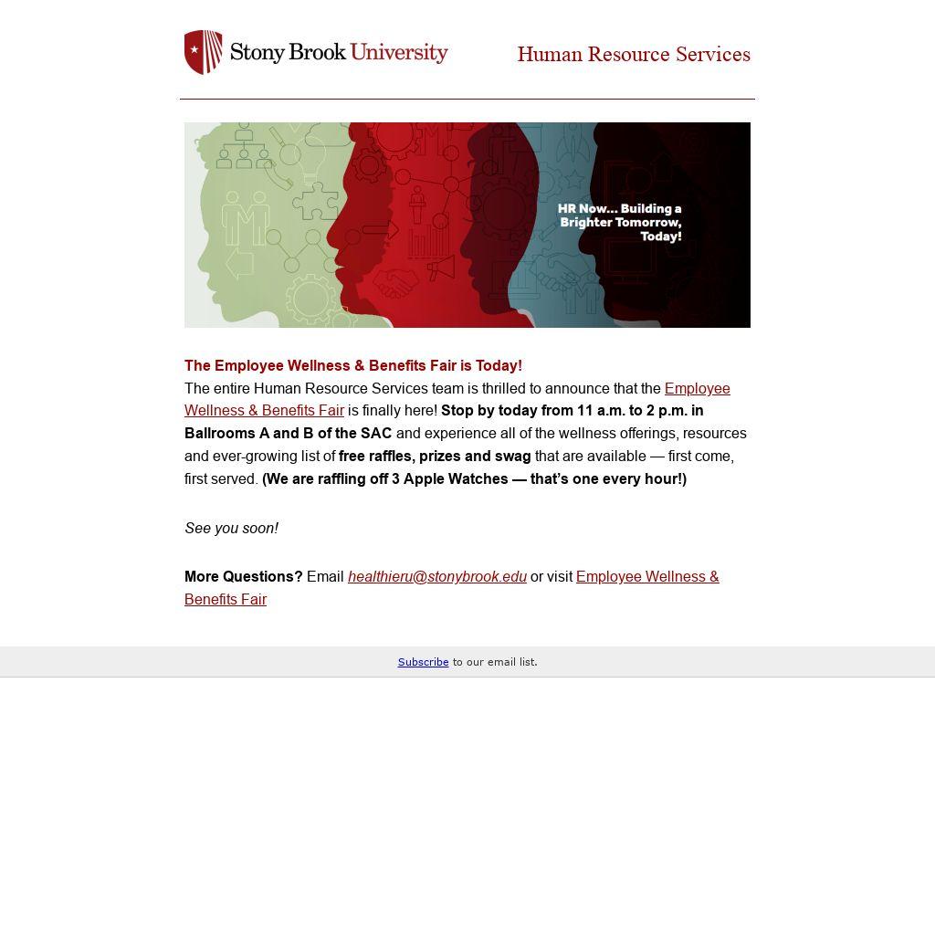 The entire Human Resource Services team is thrilled to announce that the Employee Wellness & Benefits Fair is finally here! Stop by today from 11 a.m. to 2 p.m. in Ballrooms A and B of the SAC and experience all of the wellness offerings, resources and ever-growing list of free raffles, prizes and swag that are available — first come, first served. (We are raffling off 3 Apple Watches — that’s one every hour!)