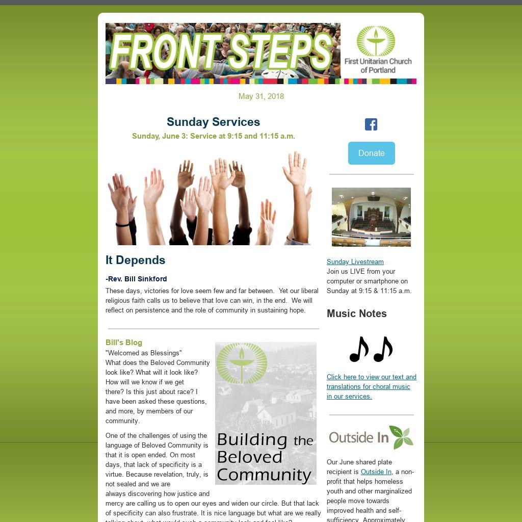 Do You Have an Item for E-news or the Sunday Bulletin?If you have an item you’d like published in our weekly Front Steps (eNews) or the Sunday Bulletin, please submit it to: