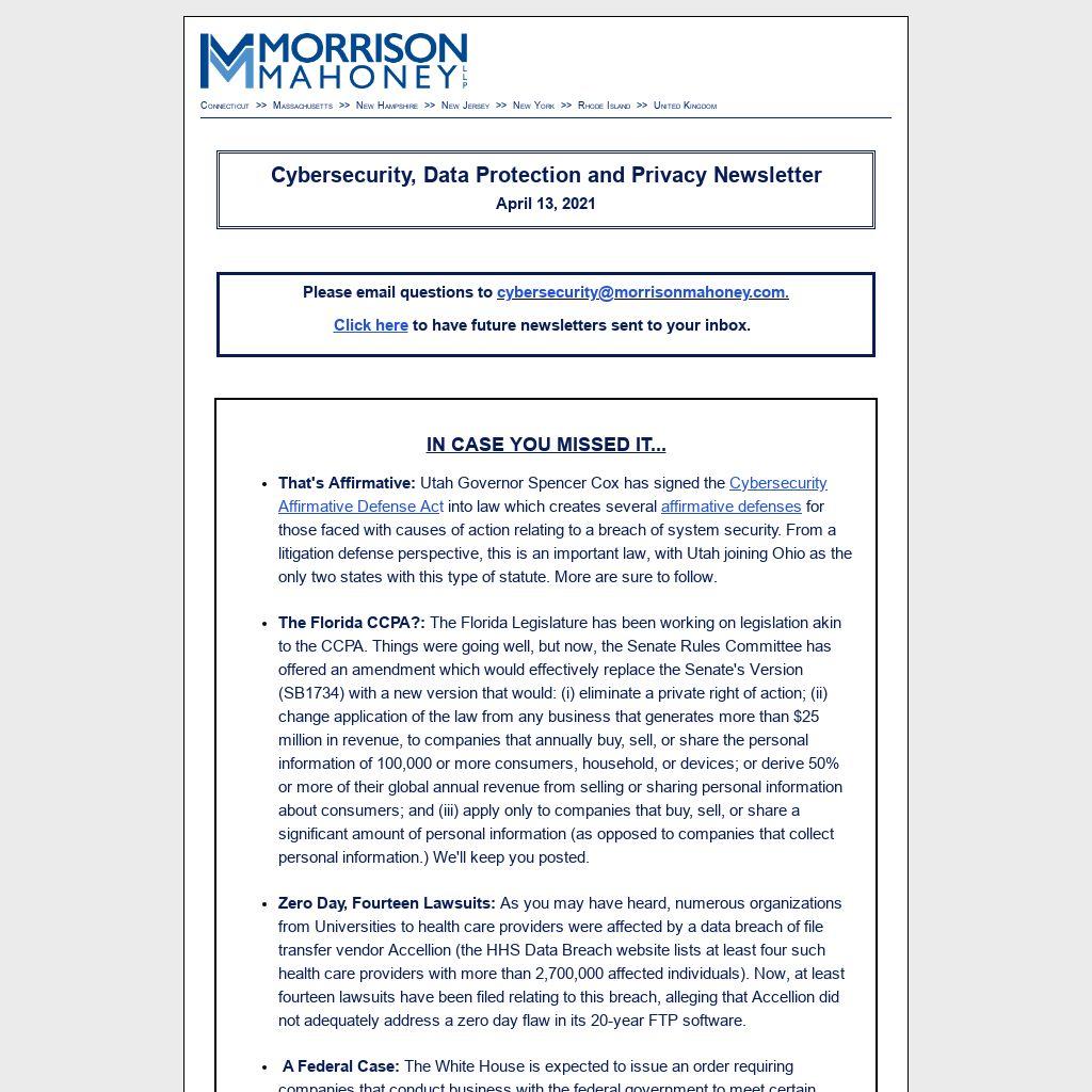 | This communication, which we believe may be of interest to our clients and friends is for general information only. It is not a full analysis of the matters presented and should not be relied upon as legal advice. If you have received this email in error, please notify the sender immediately and destroy the original message, any attachments, and all copies. This may be considered attorney advertising in some jurisdictions. If you have any questions about the items above or Morrison Mahoney's Cybersecurity, Data and Privacy Protection practice, please feel free to contact Daniel Marvin at dmarvin@morrisonmahoney.com or Robert Stern at rstern@morrisonmahoney.com. With 180 attorneys and 10 offices throughout the Northeast, Morrison Mahoney LLP is one of the leading business and litigation firms in the region. We provide a wide array of legal services covering cybersecurity, litigation, transactional, appellate and insurance coverage practice areas. For more information about the firm, visit our web site at: www.morrisonmahoney.com.