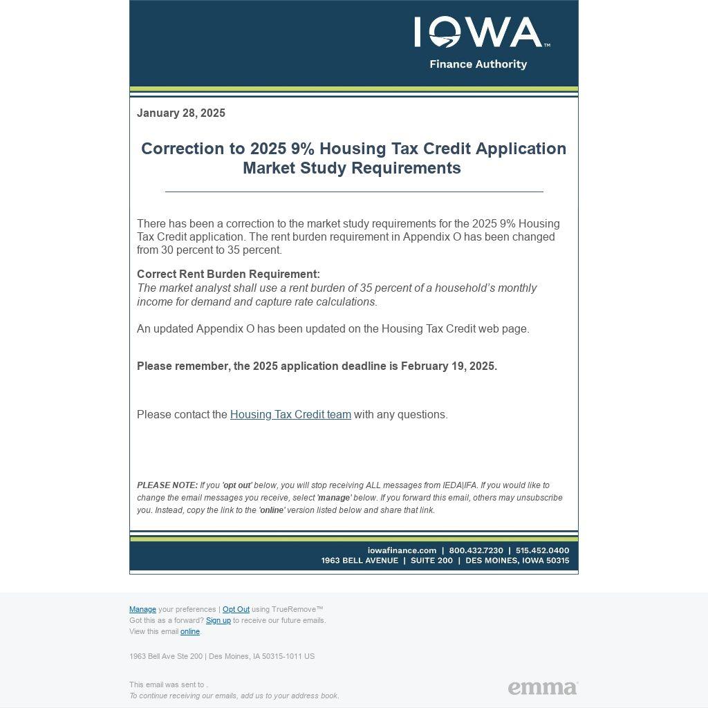 There has been a correction to the market study requirements for the 2025 9% Housing Tax Credit application. The rent burden requirement in Appendix O has been changed from 30 percent to 35 percent.