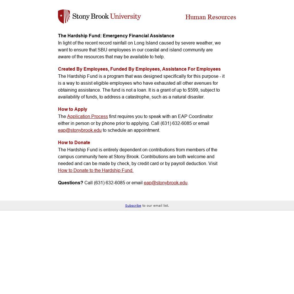 The Hardship Fund is entirely dependent on contributions from members of the campus community here at Stony Brook. Contributions are both welcome and needed and can be made by check, by credit card or by payroll deduction. Visit How to Donate to the Hardship Fund.