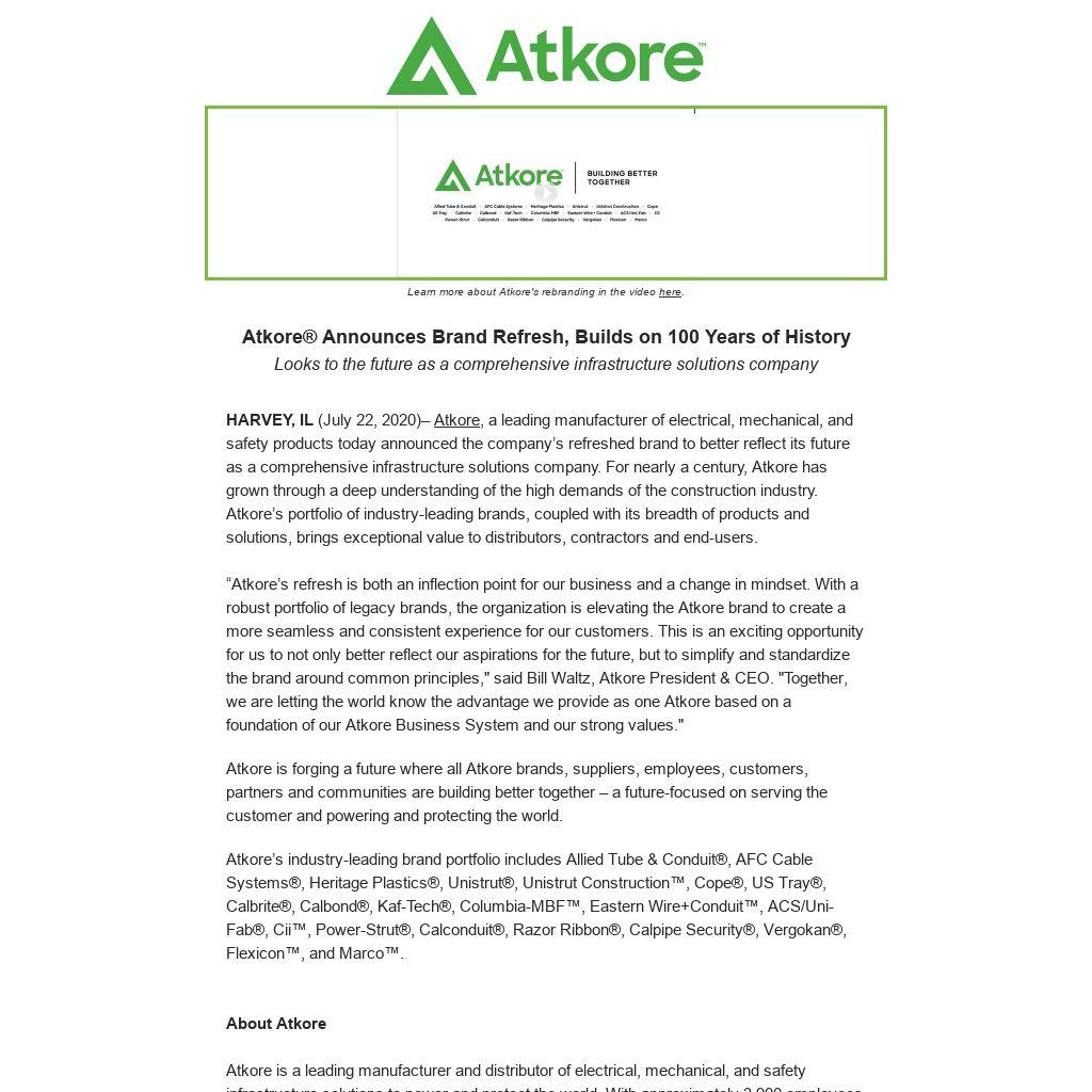 “Atkore’s refresh is both an inflection point for our business and a change in mindset. With a robust portfolio of legacy brands, the organization is elevating the Atkore brand to create a more seamless and consistent experience for our customers. This is an exciting opportunity for us to not only better reflect our aspirations for the future, but to simplify and standardize the brand around common principles," said Bill Waltz, Atkore President & CEO. "Together, we are letting the world know the advantage we provide as one Atkore based on a foundation of our Atkore Business System and our strong values."