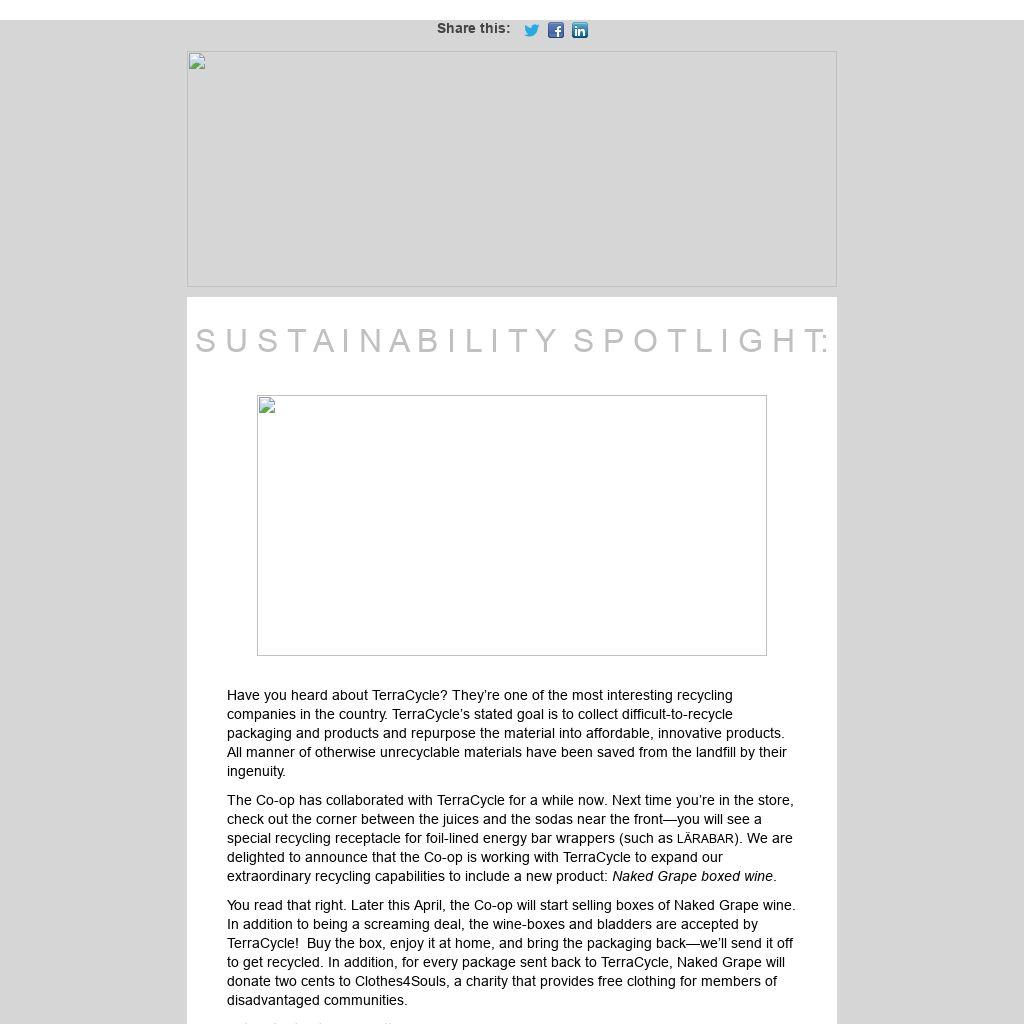 Have you heard about TerraCycle? They’re one of the most interesting recycling companies in the country. TerraCycle’s stated goal is to collect difficult-to-recycle packaging and products and repurpose the material into affordable, innovative products. All manner of otherwise unrecyclable materials have been saved from the landfill by their ingenuity. The Co-op has collaborated with TerraCycle for a while now. Next time you’re in the store, check out the corner between the juices and the sodas near the front—you will see a special recycling receptacle for foil-lined energy bar wrappers (such as LÄRABAR). We are delighted to announce that the Co-op is working with TerraCycle to expand our extraordinary recycling capabilities to include a new product: Naked Grape boxed wine. You read that right. Later this April, the Co-op will start selling boxes of Naked Grape wine. In addition to being a screaming deal, the wine-boxes and bladders are accepted by TerraCycle! Buy the box, enjoy it at home, and bring the packaging back—we’ll send it off to get recycled. In addition, for every package sent back to TerraCycle, Naked Grape will donate two cents to Clothes4Souls, a charity that provides free clothing for members of disadvantaged communities. But wait—it gets even better. Whenever you bring back a clean package of Naked Grape boxed wine for recycling, our cashier will give you a coupon for $1 off your next purchase of the same!