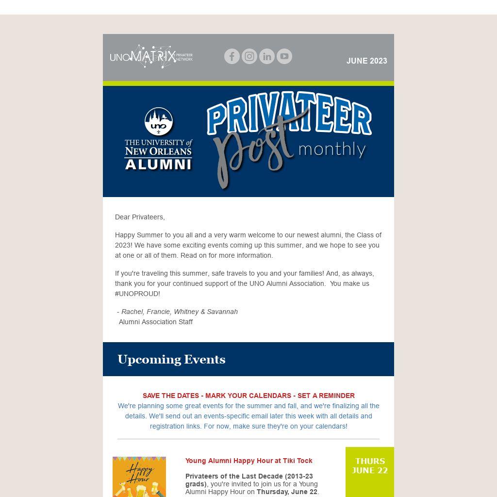 Privateers of the Last Decade (2013-23 grads), you're invited to join us for a Young Alumni Happy Hour on Thursday, June 22. We'll meet at Tiki Tock bar at The Frenchmen Hotel. Have a drink and some nibbles on us, and reminisce about the not-so-long-ago memories from UNO.