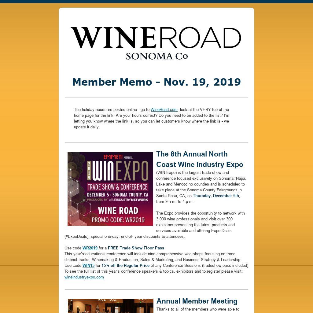 My take away ~ we need you to share the content we create. To help with that, at the beginning of each month, we will be sending you a content sharing tool kit. We will include text, photos and a link the newsletter, podcast and various blogs - so you can easily pick what makes the most sense for you to cut and paste into your newsletters, wine club shipments or social sharing. The content is developed for you to use and we want to make that process as easy as possible.