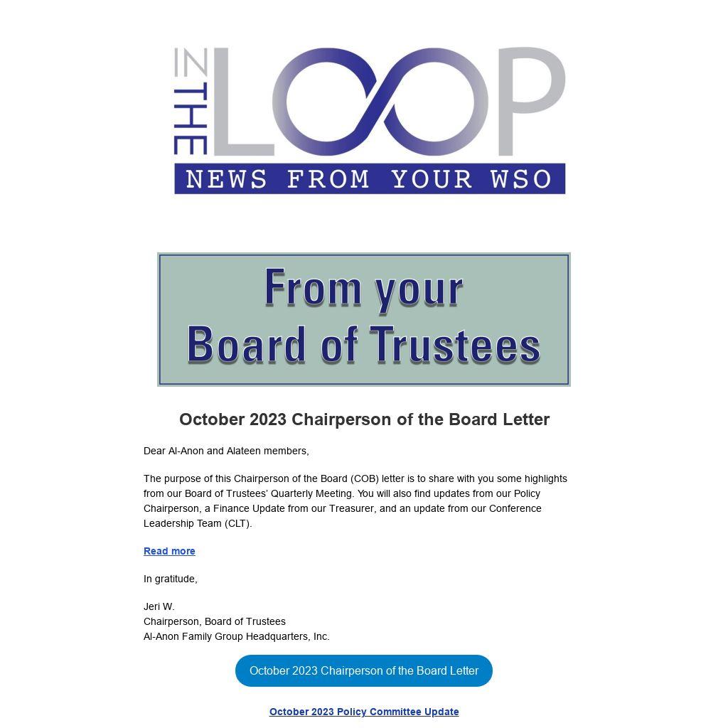 The purpose of this Chairperson of the Board (COB) letter is to share with you some highlights from our Board of Trustees’ Quarterly Meeting. You will also find updates from our Policy Chairperson, a Finance Update from our Treasurer, and an update from our Conference Leadership Team (CLT).