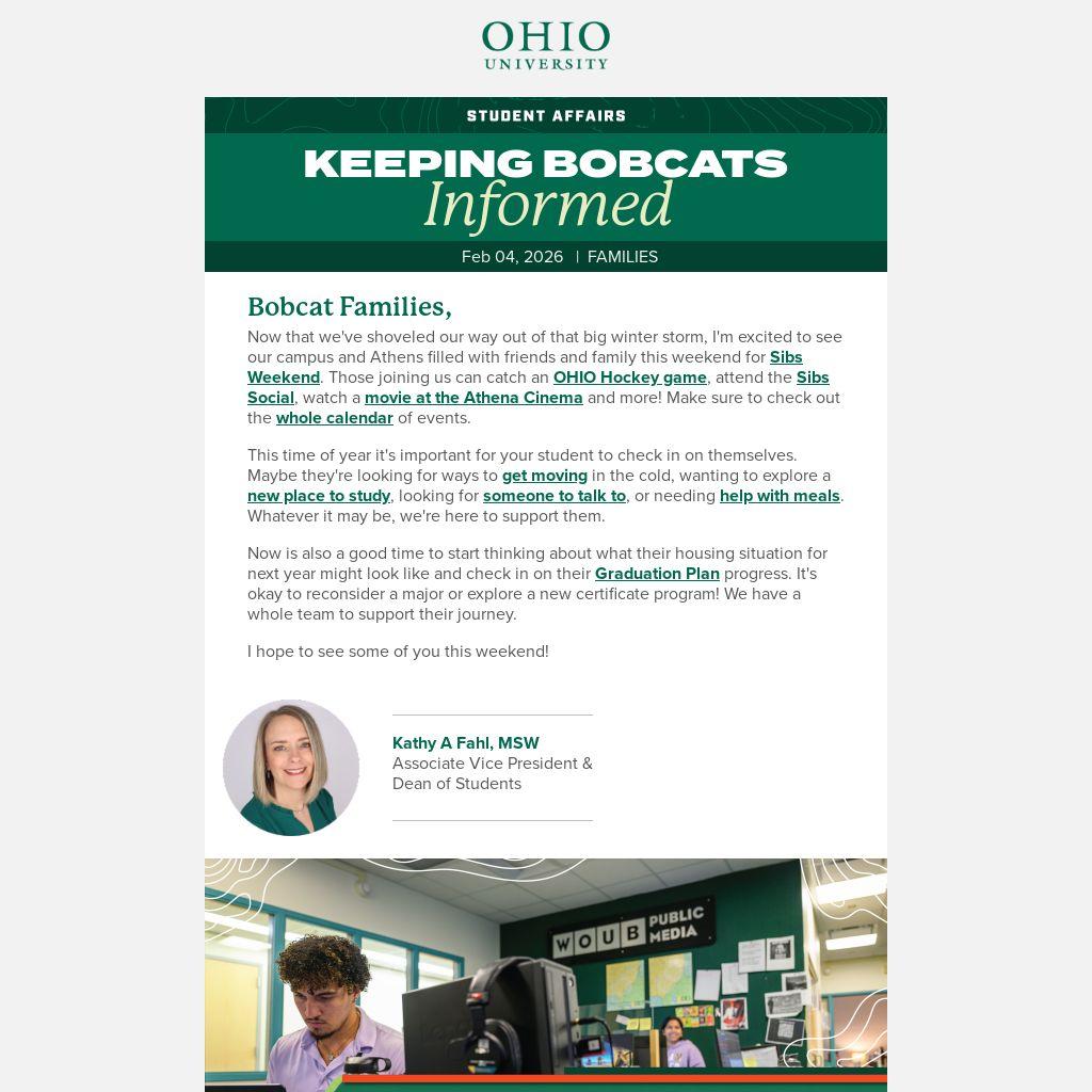 Now that we've shoveled our way out of that big winter storm, I'm excited to see our campus and Athens filled with friends and family this weekend for Sibs Weekend. Those joining us can catch an OHIO Hockey game, attend the Sibs Social, watch a movie at the Athena Cinema and more! Make sure to check out the whole calendar of events.Â